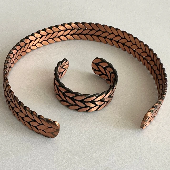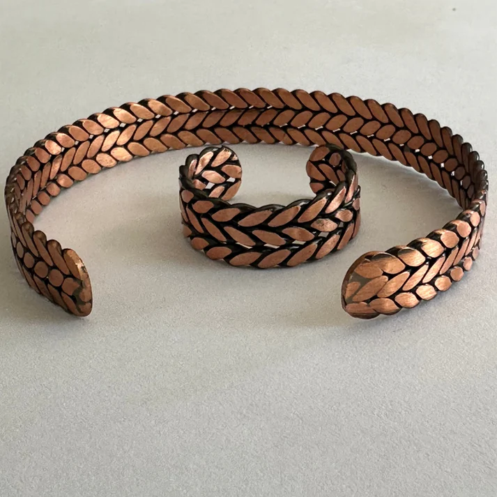 Bakırzade 3’lü Bakır Set – 23 Dualı Kolye, Örgü Motifli Bileklik ve Yüzük