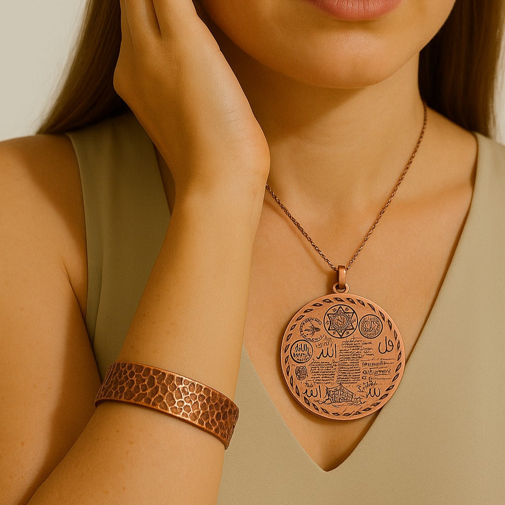 Bakırzade Dualı Kolye & Bileklik Seti, geleneksel bakır işçiliğini ve manevi sembolleri bir araya getiren özel bir tasarımdır.